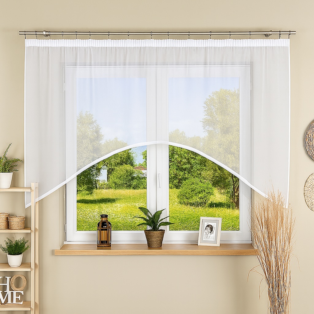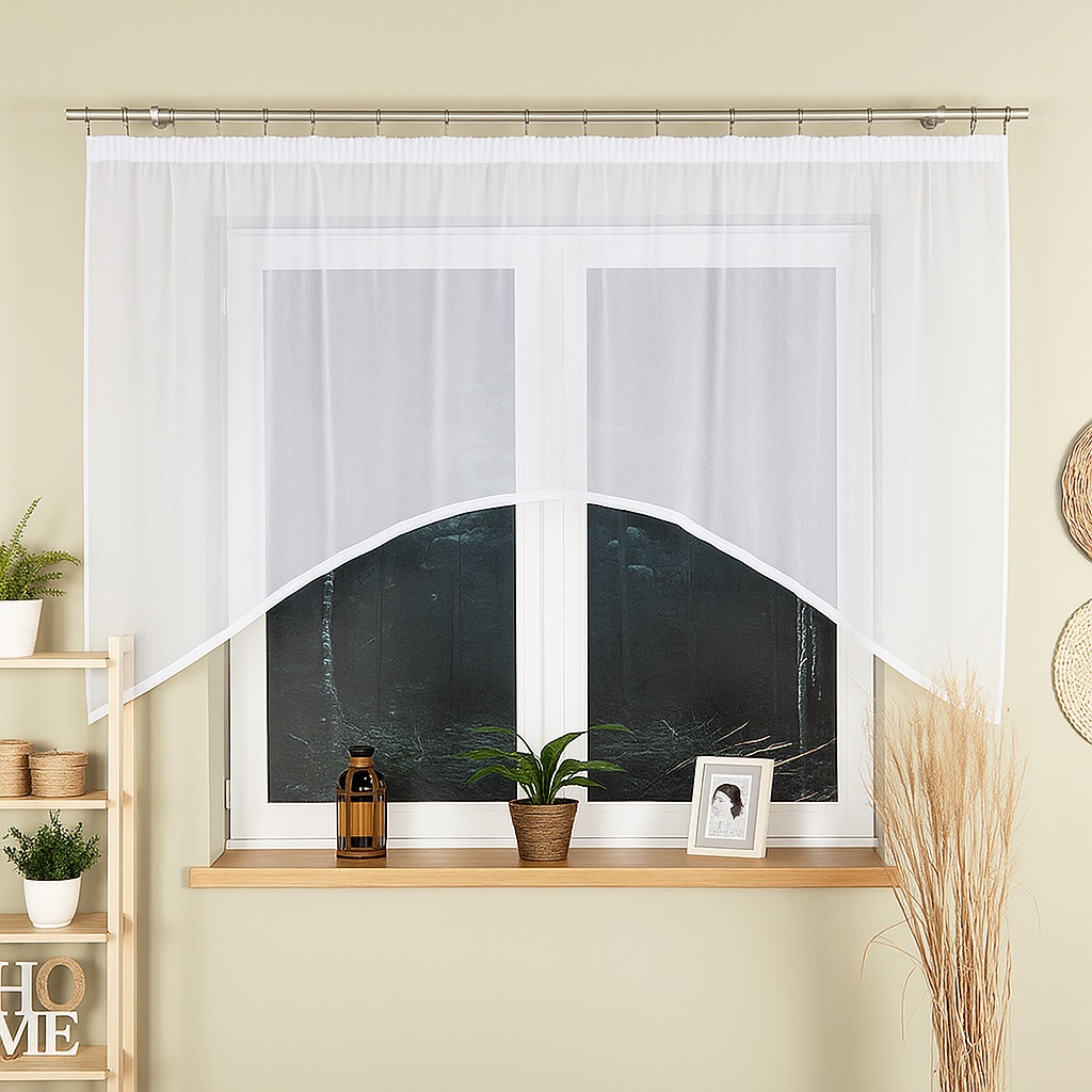 Máte otázku?Voálová záclona hladká, bílá. Našita řasící páska 1:2, obšité okraje, připravena k pověšení. Šířka záclony je uvedena před řasením, po nařasení je záclona o polovinu menší. Výška je uvedena v nejdelším místě. Poplatek za zkrácení 129 CZK/ ks.