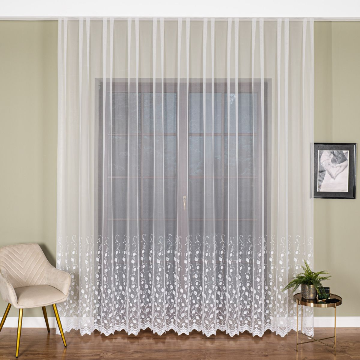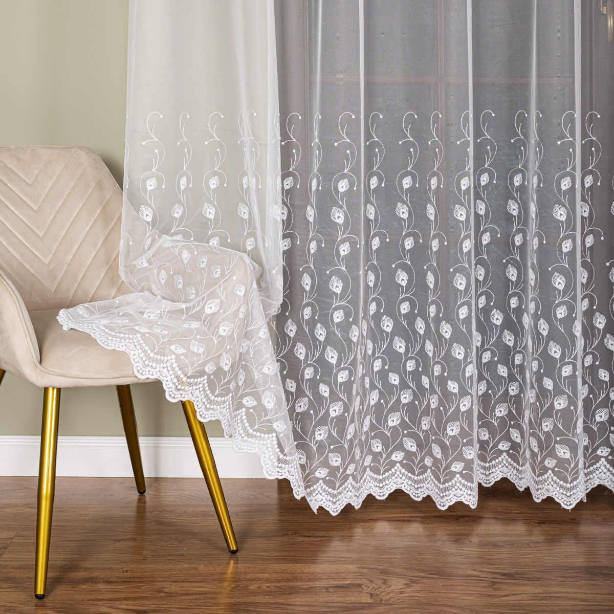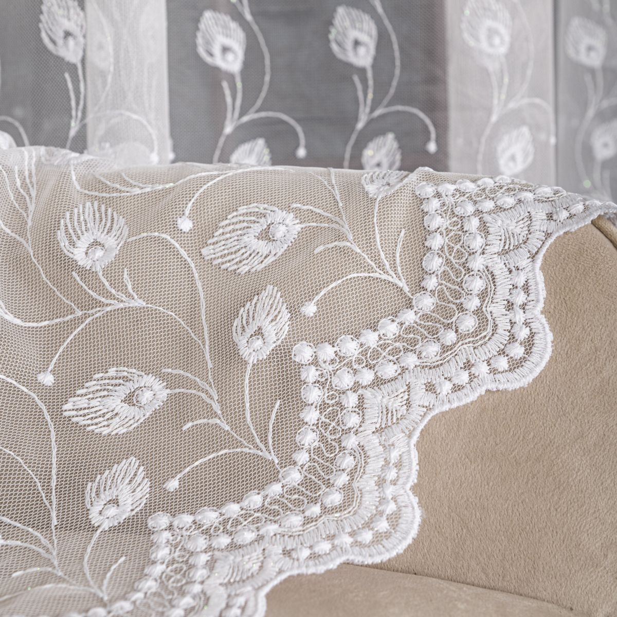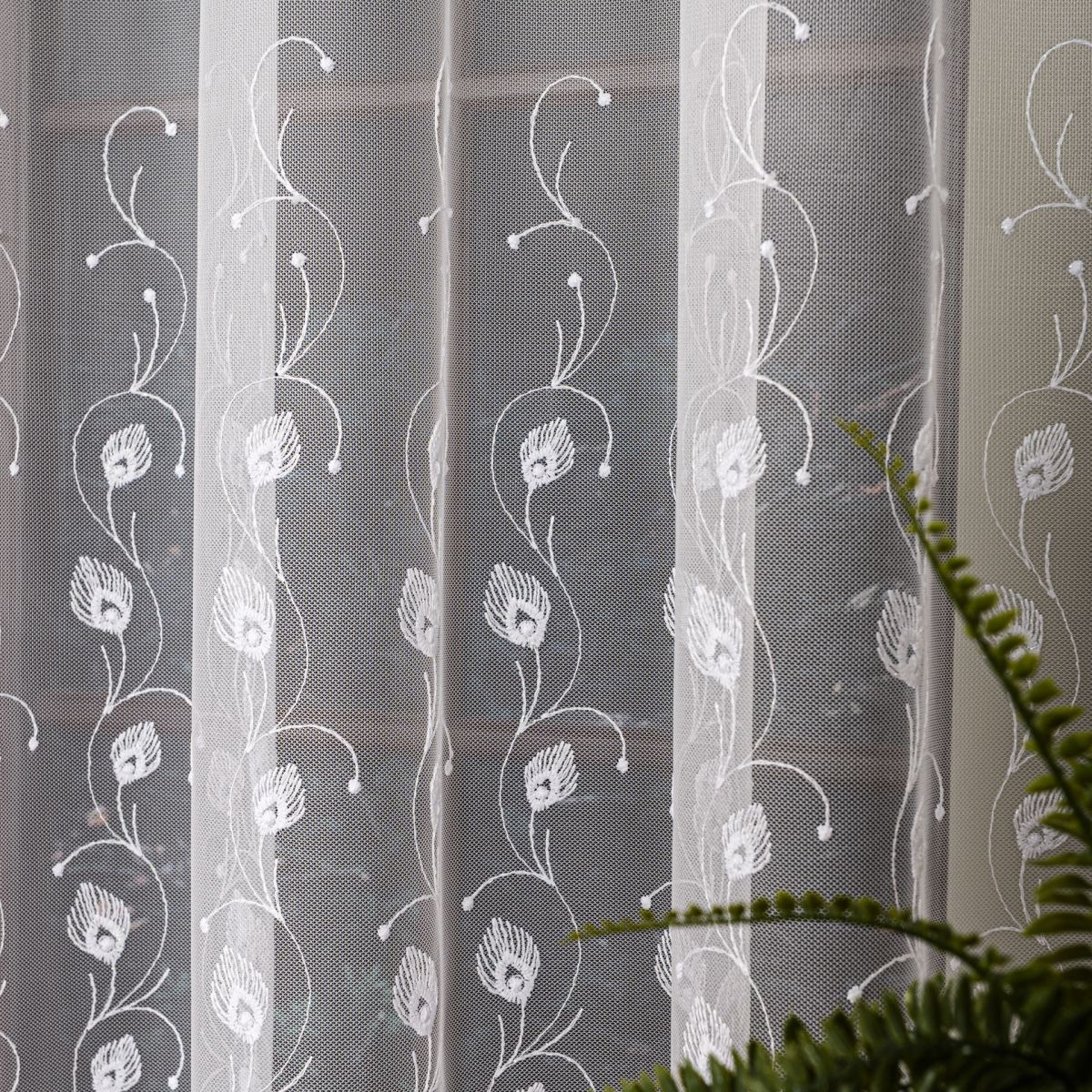 Záclona z velmi kvalitního materiálu, jednoduchá údržba. Vzor na zácloně je výšivka bílou nití. Lze ušít i jiné rozměry.Poplatek za zkrácení 129 CZK/ ks.